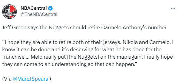 安东尼的尼克斯7号球衣有望退役,那么他的掘金15号球衣能退役吗?目前约基奇正身穿掘金15号,杰夫-格林希望掘金能退役安东尼的球衣,表示:我希望他们能把约基奇和安东尼的15号球衣都退役掉。我知道这是可以做到的,他(安东尼)为球队所做的一切都是当之无愧的。安东尼真的让掘金重新回到了世人眼中。我真的希望他们能够达成协议,这样这(退役两个球衣)就能够实现了。