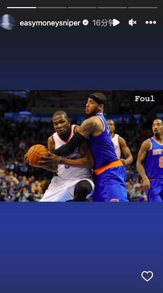 太阳球星杜兰特更新INS晒出多张与安东尼的同框照,其中一张(如配图)配文:“进攻犯规”。