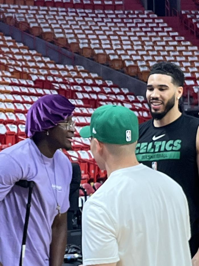 东决G3双方转战迈阿密,热火伤员奥拉迪波来到现场观战,左腿上戴着护具并且拄着拐来到球馆,戴着一顶紫色小帽十分抢镜;赛前,奥拉迪波和塔图姆开怀畅聊,两人都满脸笑容。