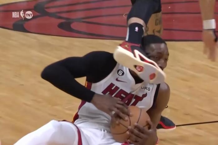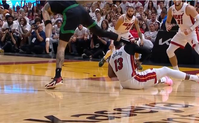 上半场最后时刻,凯尔特人继续疯狂包夹巴特勒,裁判躺枪被撞倒,巴特勒不满找裁判抱怨,然后拉起裁判;半场打完热火61-46领先15分。