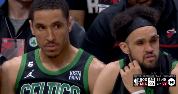 热火第三节32-17彻底打爆绿军,三节打完热火领先30分,创队史季后赛前三节最大领先分差,由于分差太大,比赛早早沦为垃圾时间,绿军众主力提前一节投降,都脸色铁青十分绝望。