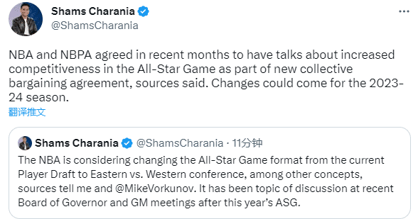 Shams还表示,就提升全明星赛的激烈程度进行讨论,是NBA与球员工会近期达成的新劳资协议内容的一部分,而全明星正赛的赛制最快可能在下赛季就发生变化。