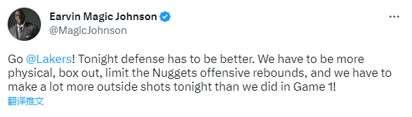 魔术师发文为湖人支招,发推写道:湖人冲啊!今天的防守表现必须更好,我们需要有更多的身体对抗,篮板卡位必须更好,要限制掘金的进攻篮板,而且我们今天必须比G1在外线投中更多球!