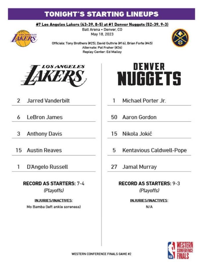 来源:24直播网05-19 11:0724直播网05月19日讯 ,NBA西决湖人与掘金G2大战一触即发,湖人输掉G1后主动变阵,范德彪顶替施罗德重返首发阵容,搭档詹姆斯、浓眉、拉塞尔和里夫斯首发出战,哈姆终于放弃三后卫首发。