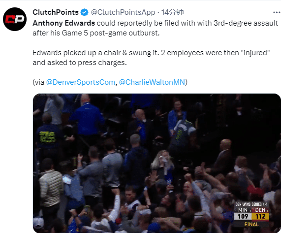 据美媒报道,在森林狼G5输球被淘汰赛后,爱德华兹离场时拿起一把椅子并挥舞它,击中了一名保安,一名消息人士证实了这一事件,并表示两名员工都受伤并被要求提起诉讼。