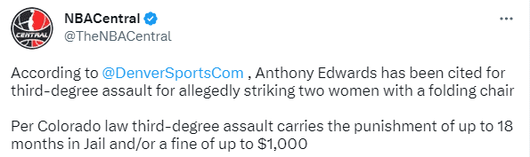 来源:24直播网04-27 11:0924直播网讯04月27日,森林狼首轮1-4被掘金淘汰出局后,狼队新星爱德华兹惹上官司,G5出局后挥舞椅子砸伤多人,因涉嫌用折叠椅殴打两名女性被指控为三级袭击罪,根据科罗拉多州的法律,爱德华兹最高面临18个月的监禁和1000美元的罚款。