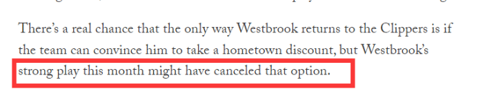 不过,快船记者Murray表示球队能给威少的续约金额有限,本来只能指望威少能够给个家乡折扣价,但随着威少季后赛的爆发,他的新合同金额预计会上升不少,威少明年留在快船的希望不大。