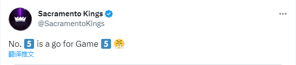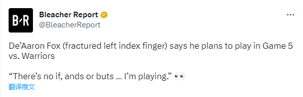 福克斯还说他出战的可能性为99%或者100%,带伤出战唯一的问题就是他能否忍受投篮时的痛疼;国王队也跟着宣布5号将会出战第5场比赛。