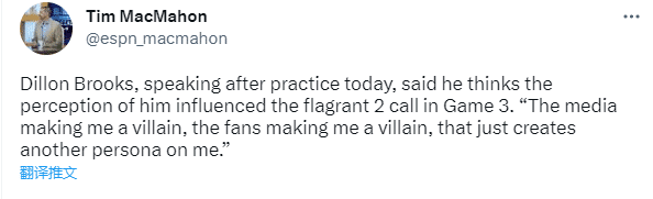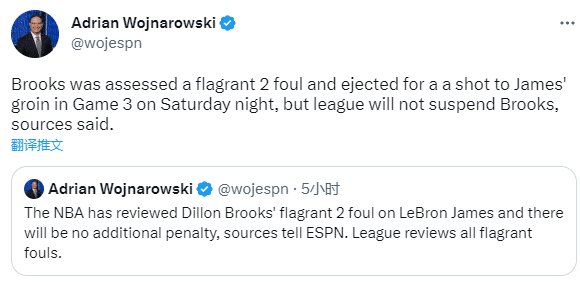 来源:24直播网04-24 11:4824直播网讯04月24日,狄龙-布鲁克斯会因袭击詹姆斯的裆部被联盟禁赛吗?据名记woj报道,联盟官方审查了狄龙对詹姆斯的二级恶意恶犯,不会有罚款以及禁赛的追加处罚。狄龙回应此事:媒体和球迷让我成为恶棍。