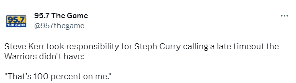 赛后谈到库里错叫暂停,科尔表示:责任100%在我;科尔主动担责,直言他应该把球队没有暂停的事告诉每个人。