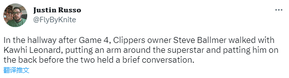 据快船随队记者Justin Russo报道,G4赛后快船老板鲍尔默与莱昂纳德走在一起,他搂着小卡并拍了拍他的背,然后两人进行了简短的交谈。