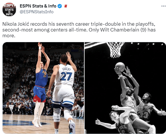 掘金客场再次击败森林狼,相比G1和G2轻松获胜,本场比赛,掘金打得相对艰难,但末节一波流拉开分差,最终仍旧是掘金笑得最后,约基奇又是划水取胜,全场13投9中拿到20分11篮板12助攻,季后赛生涯第7次三双,排在历史季后赛三双榜第10位,仅比罗伯特森(8次)少1次;在中锋三双榜上,约基奇仅次于张伯伦(9次)成为史上中锋三双第二人。