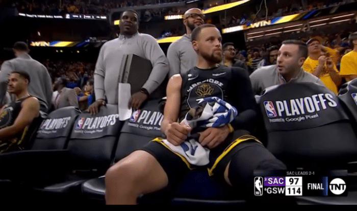 勇士赢球赛后,库里坐在替补席和教练组击掌庆祝,之后库里怒吼宣泄情绪。