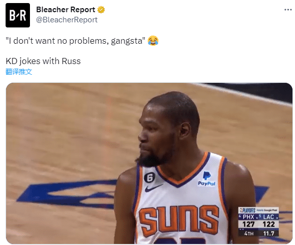 来源:24直播网04-21 15:2224直播网讯04月21日,NBA季后赛太阳G3击败快船,系列赛大比分2-1领先,布克状态火热,29投18中、三分7中3轰下45分7篮板3助攻3抢断2盖帽,攻防一体,关键2+1太蛮横;杜兰特15投8中贡献28分6篮板5助攻2抢断,关键时刻连续四罚锁定胜局,比赛期间杜兰特被冤枉一幕曝光,识破威少“诡计”猛缩手却难逃一劫;最后时刻杜兰特被凶狠撞倒后,KD冲威少开玩笑:我不想惹麻烦 地痞。