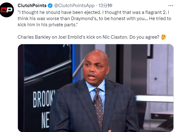 格林报复踩踏小萨事件后,恩比德恶犯袭裆也引热议,NBA名宿巴克利表示:我认为恩比德应该被驱逐离场,那是一个二级恶意犯规,我认为这比格林踩人的动作还要坏,他试图踢别人的关键部位。