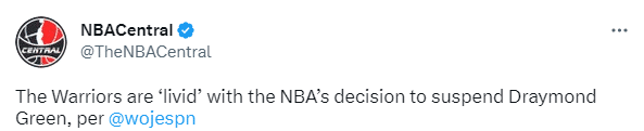 名记woj报道,勇士队对格林被禁赛感到愤怒。