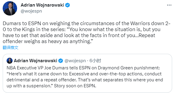 杜马斯表示,格林踩踏小萨后还和国王主场的球迷比手势并大吼大叫,这也是禁赛考虑的因素之一,杜马斯表示:后来发生的事情对现场的情况没有帮助。但如果仅此而已,联盟就不会讨论禁赛。我们关注的是行为本身,事实就是屡次违规。这是两个主要问题。