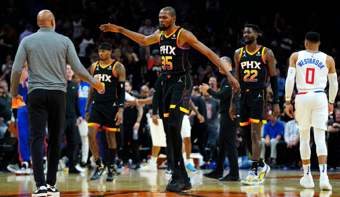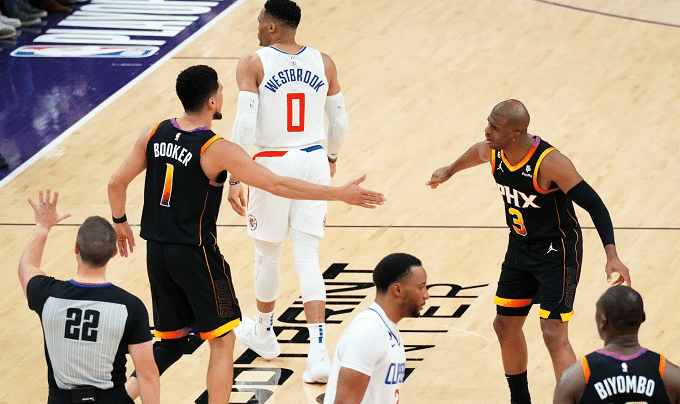 这场比赛对于太阳来说也堪称是地狱天堂,上半场一度无法限制住莱昂纳德和威少,看不到赢球的希望,要知道首战折戟的太阳已经输不起了,一旦0-2丢掉两个主场,想要晋级,将希望渺茫。好在这场比赛四大巨头爆发,布克连续的中投和上篮,杜兰特的投篮、艾顿的关键得分、保罗拯救球队,太阳才得以逆转击败快船,成功扳成大比分。