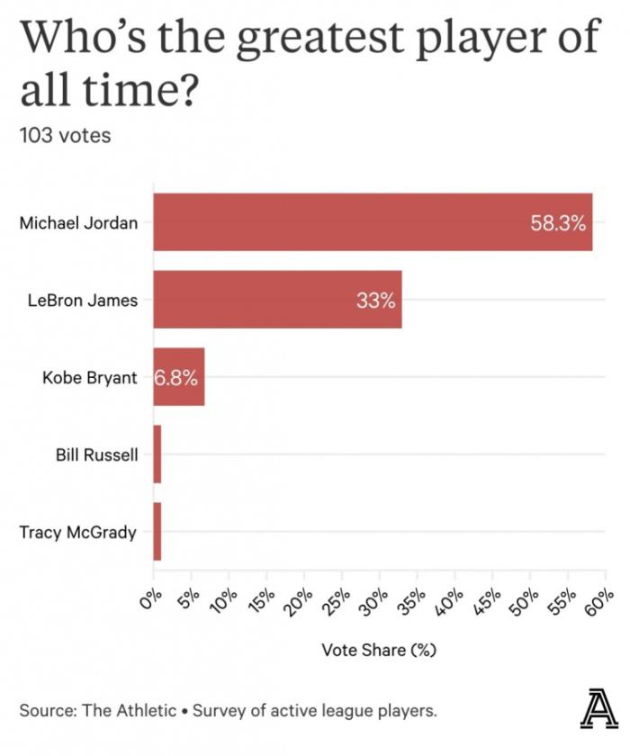 值得一提的是,美媒The Athletic邀请108名球员匿名票选谁是“NBA历史最伟大球员”,乔丹以58.3%的得票率独占鳌头,詹姆斯33%排在第二位,另外科比得票率6.8%,比尔-拉塞尔和麦迪都是1%,总计103票。