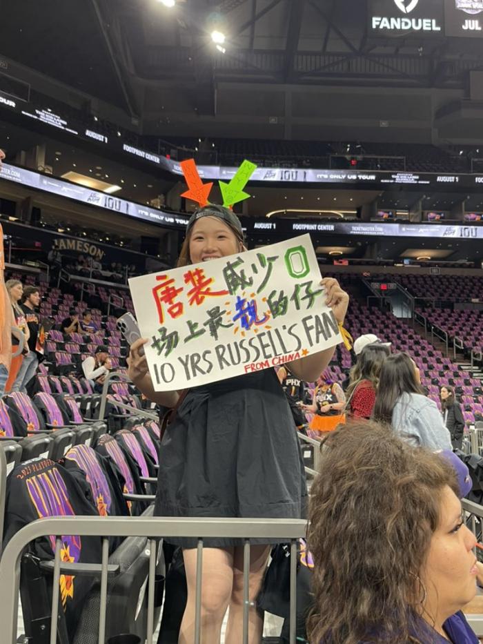 值得一提的是,威少的10年女球迷举着标语来到现场,标牌上写着:唐装威少,场上最靓的仔。来自中国的威少10年球迷。