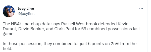 根据NBA官方数据统计,在快船和太阳G1比赛中,威少防守杜兰特3分19秒,19个回合KD3投0中,仅靠罚球拿到2分;威少防守布克3分46秒,23个回合,布克5投2中仅4分;威少防守保罗2分57秒,后者未出手;威少总共防守太阳三巨头59个回合,杜兰特、布克和保罗累计8投2中仅拿到6分,投篮命中率仅仅只有25%。