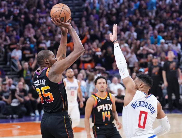 来源:24直播网04-18 09:4024直播网04月18日,快船和太阳系列赛G1,威少防守太阳三巨头的数据出炉,据统计,威少防守杜兰特、布克和保罗59个回合,仅仅让他们拿到6分,BCD投篮命中率仅仅只有25%。