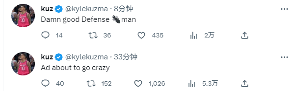 浓眉开场打得侵略性十足,第一节9分15秒,范德比尔特三分打铁不中,浓眉冲进内线欲隔扣唐斯,隔扣不进并且身体失衡倒地,浓眉险成功隔扣唐斯一幕引热议,美媒纷纷转发如此一幕,库兹马发推浓眉太疯狂了。
