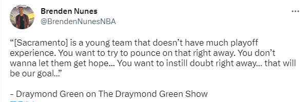 对于首轮大战国王,勇士球星德拉蒙德-格林在节目中表示:国王是一支没有太多季后赛经验的年轻球队,对阵这样的对手,你会想立马抓住机会。我们不想让他们觉得有希望,尽快将他们打到怀疑人生,这就是我们的目标。