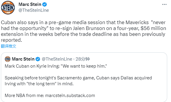 库班还表示:我认为我们有很好的机会和欧文达成续约。