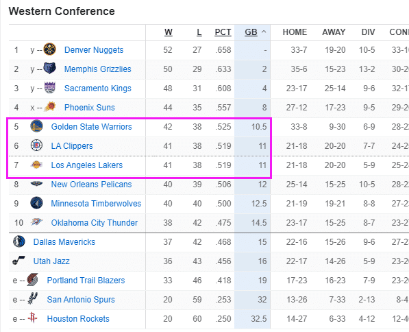目前西部已经有掘金、灰熊、国王和太阳四支球队提前锁定季后赛,仅剩最后2个直通季后赛的资格,湖人、勇士和快船三队激烈争夺第5和第6,三队仅仅只差0.5个胜场,这是西部最大悬念之一,这可能要持续到赛季结束才能确定排名。