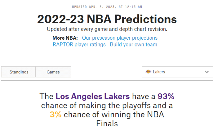 根据权威网站FiveThirtyEight最新预测,湖人晋级季后赛的概率已经升到为93%,大概率重返季后赛。