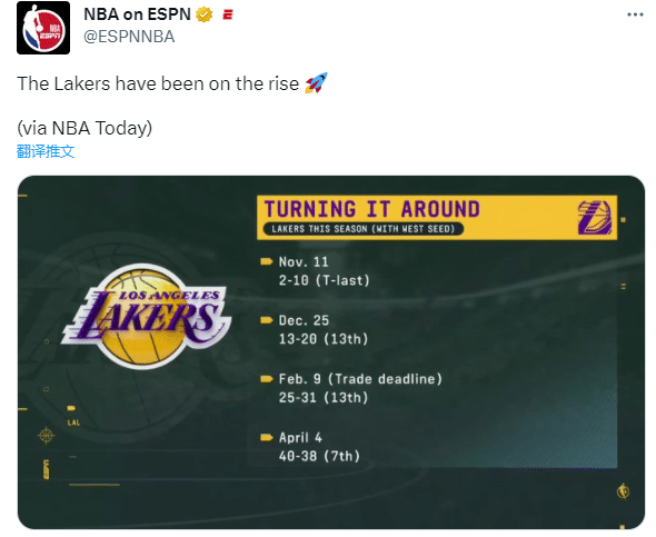 本赛季湖人队打得十分艰难,美媒回顾湖人的整个赛季——11月12日湖人取得2胜10负,排在西部倒数第一(和火箭并列);12月26日圣诞节时湖人战绩13胜20负,排在西部倒数第三;在交易截止日之前(2月10日),湖人25胜31负仍排在西部倒数第三;到目前为止,他们41胜38负排在西部第七。