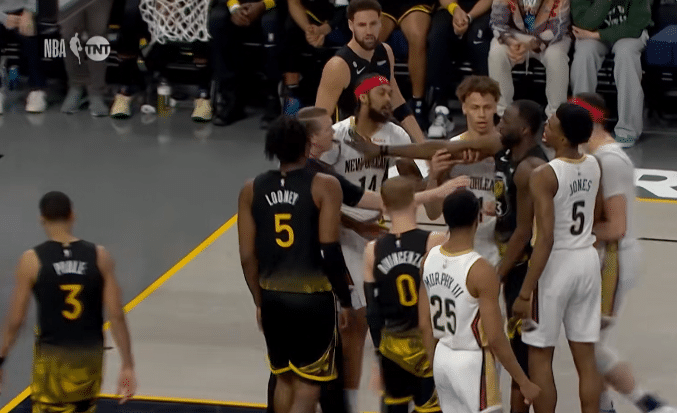 下一个回合,格林持球强打撞倒琼斯,倒地时他的脚踢到琼斯的脑袋,还踢到琼斯的腹部,这两个踢人动作引冲突;卢尼第一时间挡在格林前面,英格拉姆为队友抱不平,冲着格林怒喷垃圾话。