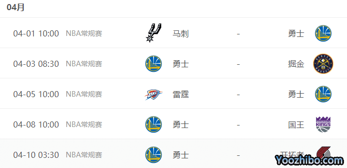 最后5场比赛,勇士先后对阵马刺、掘金、雷霆、国王和开拓者,2个主场3个客场。