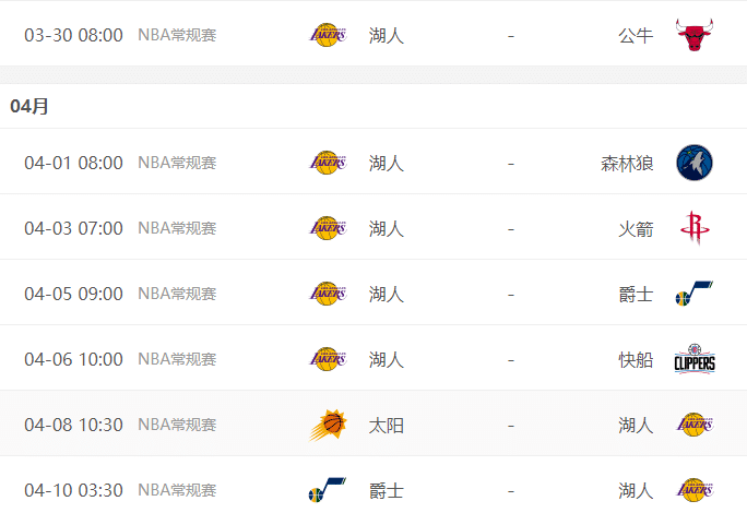 湖人最后7场赛程,先后五连客对阵公牛、森林狼、火箭、爵士和快船,回到主场后对阵太阳和爵士;詹姆斯和浓眉带队远赴芝加哥再战公牛,拉塞尔有望复出,老詹有望回到首发阵容中。
