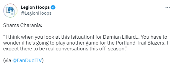 名记shams在节目中表示:我被告知利拉德基本上已经不会出战本赛季的剩余比赛了。上周末结束时他们还剩9场比赛,他正好在应对一次小腿伤病,所以他们选择让他休战。不过我认为更多的原因在于开拓者距离附加赛的席位已经相差4.5个胜场,考虑到剩余比赛的情况,他们本赛季基本上已经结束了。他们还有今年的乐透顺位保护首轮选秀权,所以他们有动力进入乐透区,保持乐透签位,看看能否碰运气进入乐透抽签的前三或前五。然后他们可以用这个选秀权去选人或交易。