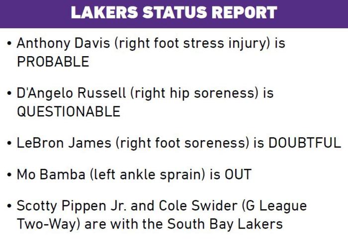 下一场对阵公牛,拉塞尔出战成疑,浓眉仍旧是大概率出战,班巴因伤继续休战,小皮蓬和斯威德仍在发展联盟,与之前相比,湖人伤病报告唯一的变化就是詹姆斯的状态从一直缺战升级为小概率出战,詹姆斯复出倒计时;值得一提的是,虽然浓眉还在伤病名单上,但这不影响他参加比赛,预计下一场仍会继续出战。