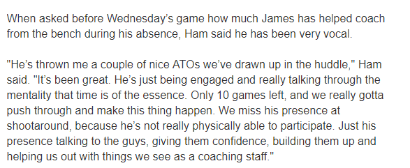 詹姆斯伤停期间在湖人教练组中扮演重要角色,此前湖人主帅哈姆曾表示詹姆斯能在暂停时给他提出不错的战术,他真的太棒了,最后10场比赛(实际只剩9场),我们必须坚持到底并且实现重返季后赛的目标,我们十分想念他,他和球员们交谈,给他们信心以及帮我们解决问题,我们把他视为教练组的一员。