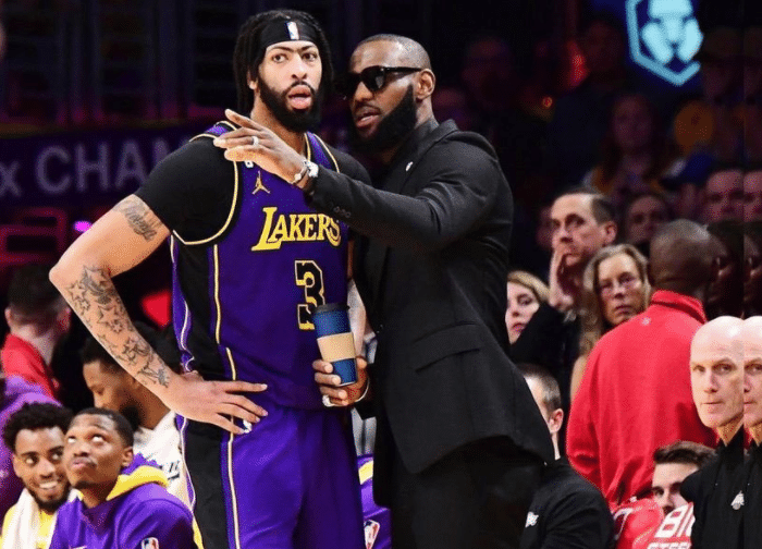 施罗德、拉塞尔、里夫斯、比斯利以及克里斯蒂都站在第二排,哈姆、汉迪等湖人教练组成员都站在最后一排;合影期间,施罗德示意浓眉笑一笑,之后浓眉强颜欢笑;詹姆斯、施罗德等人都满脸笑容。