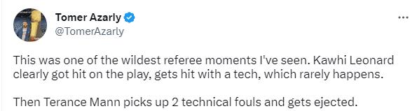裁判连吹快船3个技犯引热议,名记Tomer Azarly表示这是我见过的最疯狂的裁判时刻之一。科怀-莱昂纳德显然在比赛中被犯规,他吃T这样的事很少发生,然后曼恩连吃两T被驱逐。