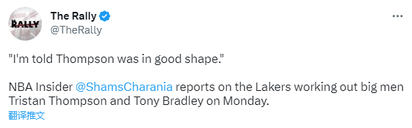 shams透露湖人试训的情况,表示:今日湖人试训了特里斯坦-汤普森和托尼-布拉德利。我被告知,汤普森的体型很好。托尼-布拉德利这赛季为公牛打过球,他的竞技水准有更多的近期样本。汤普森这赛季还没打过球,他上赛季在公牛打完的,实际上他和布拉德利还是队友。我们拭目以待,湖人还有一个阵容名额,他们一直在寻找大个子球员,我们会看看他们是否将在未来几天内签下汤普森或布拉德利。