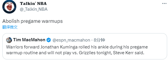 今天勇士对阵灰熊赛前,勇士新星库明加也崴脚受伤,确定缺席比赛,对此美媒Talkin NBA调侃联盟应该取消热身。