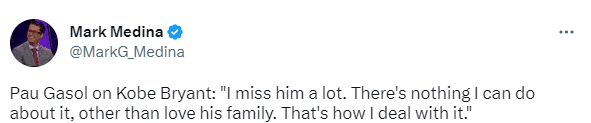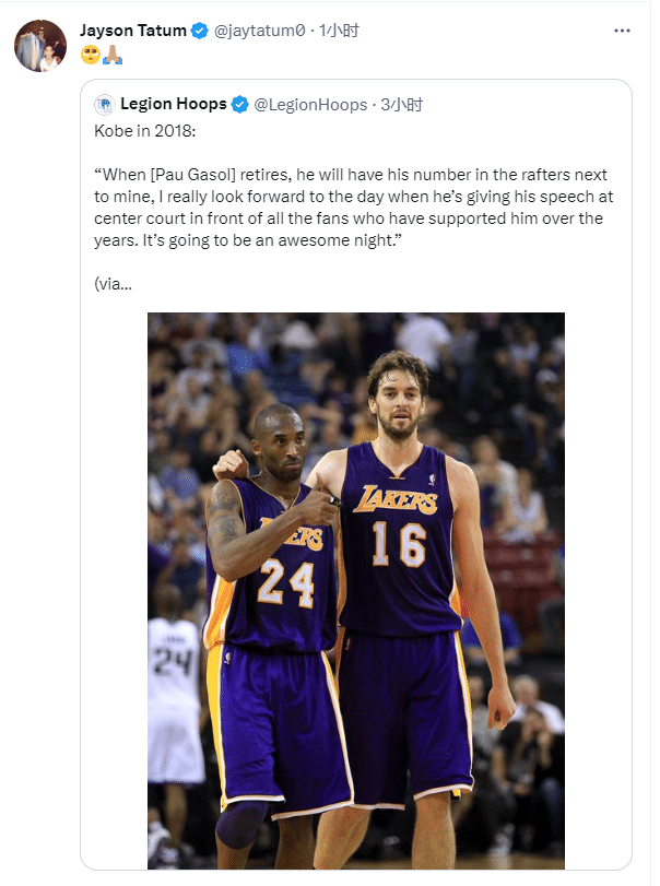 加索尔球衣退役日,科比5年前言论被挖出,在2018年时,湖人传奇球星科比-布莱恩特曾说:当保罗-加索尔退役时,他的号码会悬挂在我的号码旁边的椽子上,我真的期待有一天他在球场中央面对所有多年来支持他的球迷发表演讲。这将是一个了不起的夜晚。