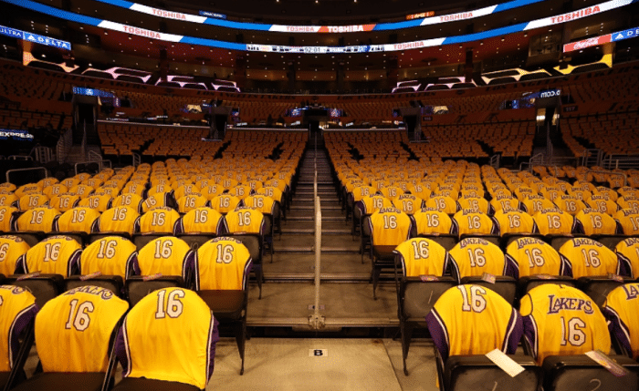 湖人在主场观众席上铺满了加索尔的复刻版16号球衣,到场的每一名球迷都可以获得一件纪念版球衣,现场球衣汇聚成金色海洋,这画面太震撼。