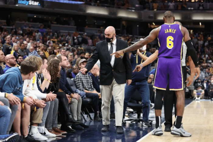 为何威少举报场边的球迷?很可能是球迷骂人了,这就是惹怒威少的后果,值得一提的是,詹姆斯也曾向裁判举报骂他的球迷,结局都是一样,球迷被驱逐离场。