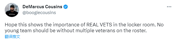 对此,考辛斯发推表示:“希望这件事能够说明更衣室里有一名真正的老将的重要性,任何年轻的球队都不能没有这些老将。