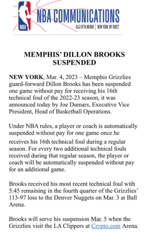 NBA官方宣布,灰熊悍将狄龙-布鲁克斯因累计技术犯规已达16次,将被自动禁赛一场,从而缺席下一场与快船的比赛。