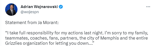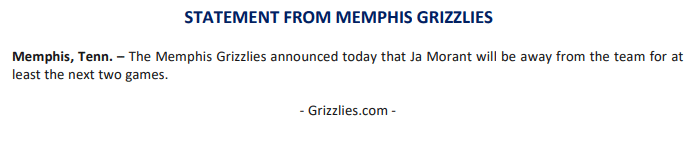 莫兰特正式公开道歉,莫兰特声明: 我为我昨晚的行为负全部责任,我要向我的家人、队友、教练、球迷、合作伙伴、孟菲斯市和球队道歉,我让你们失望了。我要花点时间去寻求帮助,学习更好的方法来应对压力,改善我的整体健康状况。