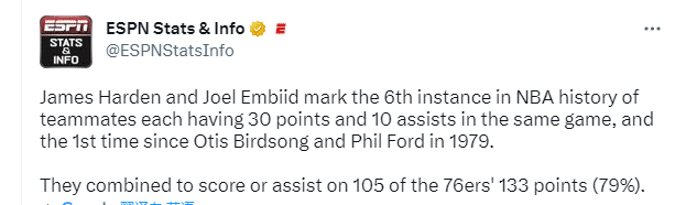 哈登和恩比德同砍30+10是NBA历史上第六次单场比赛有两名队友同时砍下至少30分10助攻,也是联盟自1979年以来首次,成为NBA近44年首对做到的组合。