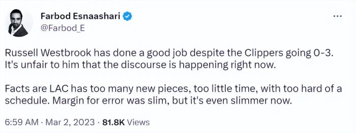 当然,也有人力挺威少,比如快船记者Farbod Esnaashari。他在社媒上写道:“尽管威少加盟快船后球队0胜3负,但他的表现很出色。现在对于威少的讨论是不公平的。事实上快船最近有好几个新援,而且赛程非常紧密,时间很短。容错空间本来就小,现在更小了。”